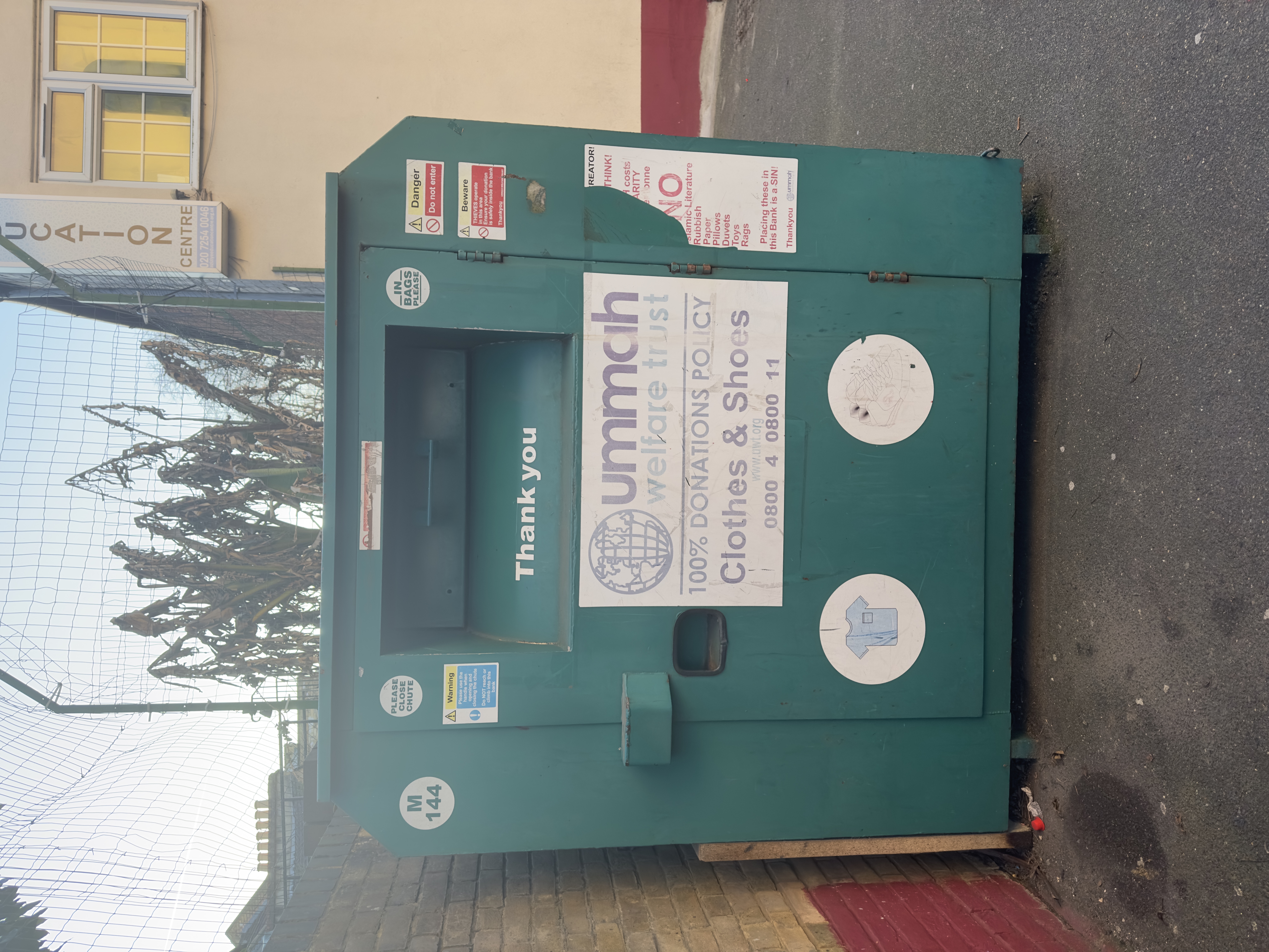 This extended car park also contains an Ummah Welfare donation bank on the left, where clothing donations are accepted and shipped to those in need.